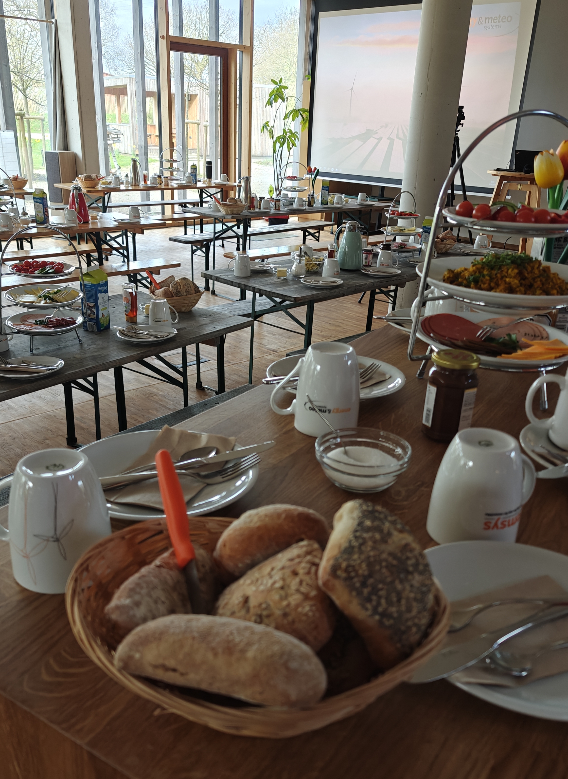 Einmal im Monat werden sämtliche Esstische, die wir auftreiben können, in unser Foyer gebracht und dort liebevoll eingedeckt. Um 9 Uhr werden dann sämtliche Kolleg:innen vom Croissantduft zum Firmenfrühstück gerufen.