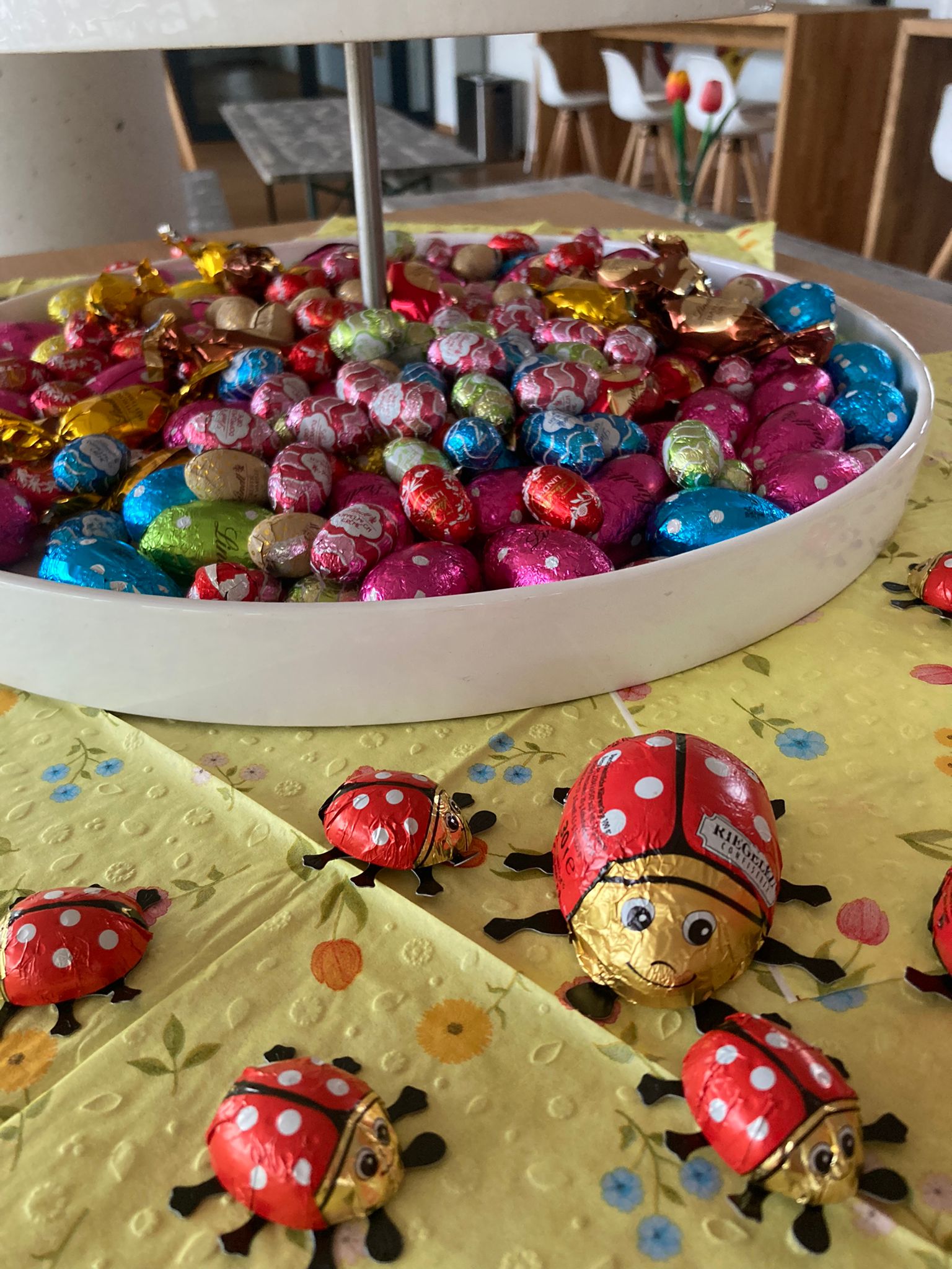 Über Ostern haben sich Schokoladenkäfer und -eier im Firmengebäude verteilt. Während in der Kantine ein ordentliches Nest gefüllt ist, stehen kleine Lindt-Häschen an der Treppe Spalier und wenn man genau hin sieht, findet man auch noch süße Geschenke an unerwarteten Stellen wie zB der Besprechungsraumlampe.