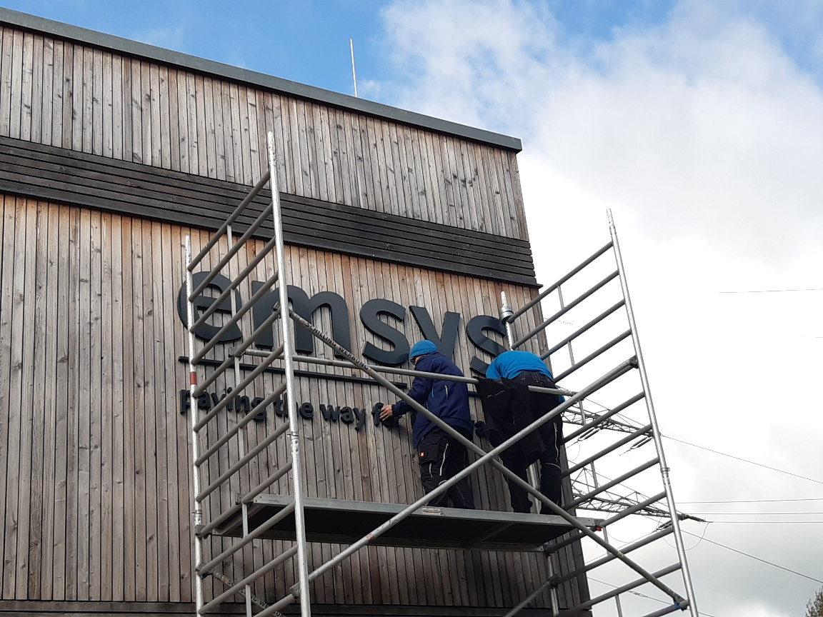 Mit drei Firmen unter einem Dach war die Entscheidung nicht so einfach, aber wir haben nun unser gemeinsames Logo "emsys - paving the way for renewables" an der Außenwand angebracht. Der Name prangt Richtung Auffahrt und verkündet der Welt (oder zumindest den Passanten), dass wir uns komplett den Erneuerbaren Energien verschrieben haben. Und der große Schriftzug an der Wand ebnet nun auch den Weg für unsere Besucher.