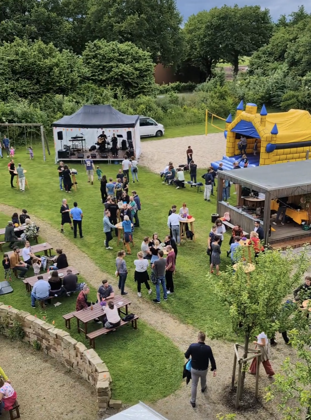 Die Mitarbeitenden haben für ein Geburtstagsgeschenk zusammengelegt und beim örtlichen Künstler Jörg Ridderbusch eine geschmiedete Windkraftanlage bestellt. Nach der Übergabe nahm die Indie-Pop-Band Lyuna die Bühne ein, auf der anschließend ein Kollege für das Kinderprogramm einen leider kranken Delphin vertrat. Unsere Kolleg:innen aus der Küche haben ein opulentes Kuchen- und Abendbuffet gezaubert und es gab grandiose Cocktails aus dem Caravan. Später haben die Bands SoulFood und Skalinka uns ordentlich eingeheizt, bevor Mr. 5000 aufgelegt hat. Bis spät in die Nacht wurde noch das Tanzbein geschwungen – so muss ein Sommerfest sein.
