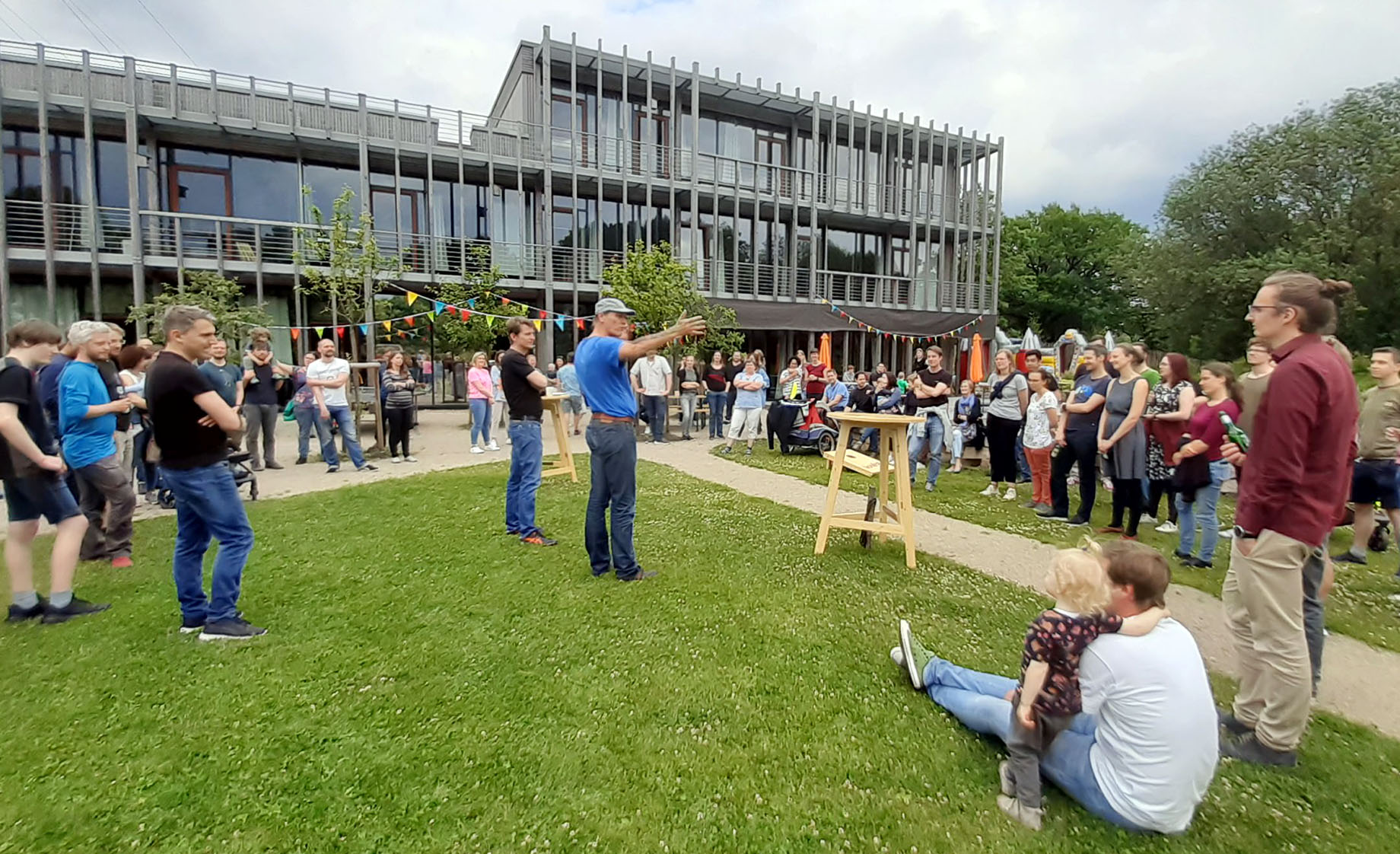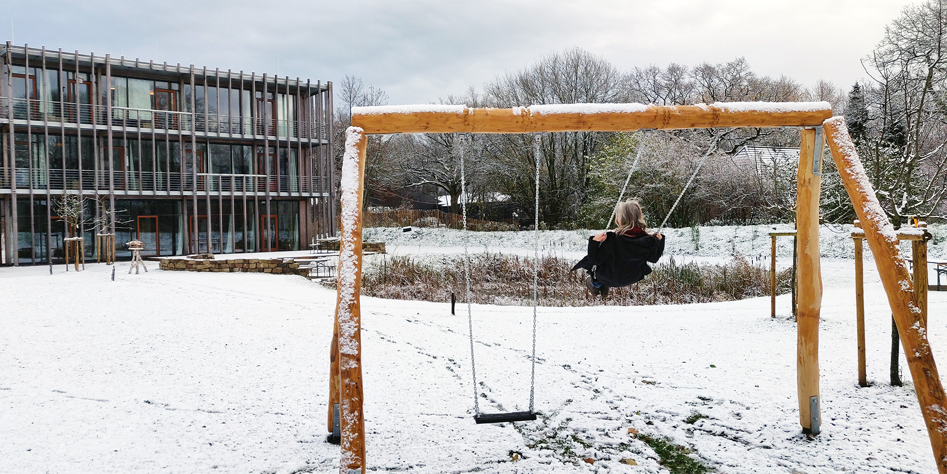 Nach einigen Lieferengpässen konnten jetzt endlich die Schaukeln im emsys-Garten eröffnet werden. Natürlich musste sie – rein aus Qualitätssicherungsgründen – auch sofort eingeweiht werden. Das Ergebnis: Es geht hoch hinaus. Jetzt muss sich nur noch jemand finden, der auch die neuen Reckstangen ausprobiert.