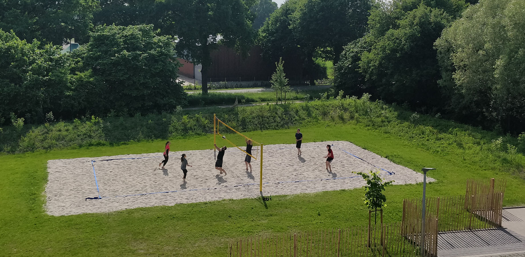Die zweite Saison mit eigenem Beachvolleyballfeld zahlt sich aus - der "harte Kern" des Teams hat die Spielqualität deutlich angehoben, wovon natürlich auch die Gelegenheitsspieler profitieren. Zeit für neue Herausforderungen: Neu im emsys-Garten ist seit kurzem das Spikeballnetz.