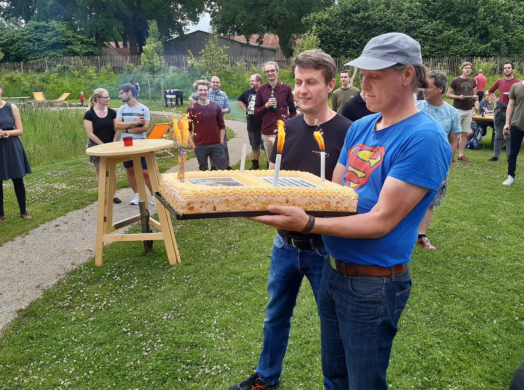 Letzten Freitag wurde der Jahrestag unseres ersten Kundenbesuchs gebührend zelebriert: Unsere Chefs hatten alle emsysler samt Familien zum Gartenfest eingeladen. Dem Anlass entsprechend gab es Torte und ein Grillbüffet sowie ganz klassisch eine Hüpfburg für alle Altersgruppen.
