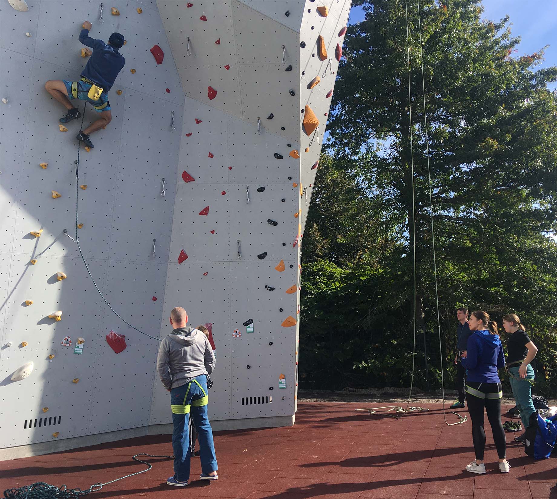 Iris hat in drei Probestunden ein Dutzend Kollegen und deren Angehörige in die Nutzung des Kletterturms eingewiesen. Vom Schnupperkletterer bis zum erfahrenen Boulderer waren alle Vorkenntnisstufen vertreten, und bei schönstem Herbstwetter haben sich die Kraxler gegenseitig zu Höchstleistungen angespornt. Im hauseigenen Chatprogramm gibt es jetzt einen eigenen Kanal für Kletterabsprachen für alle, die auch weiterhin hoch hinaus wollen.