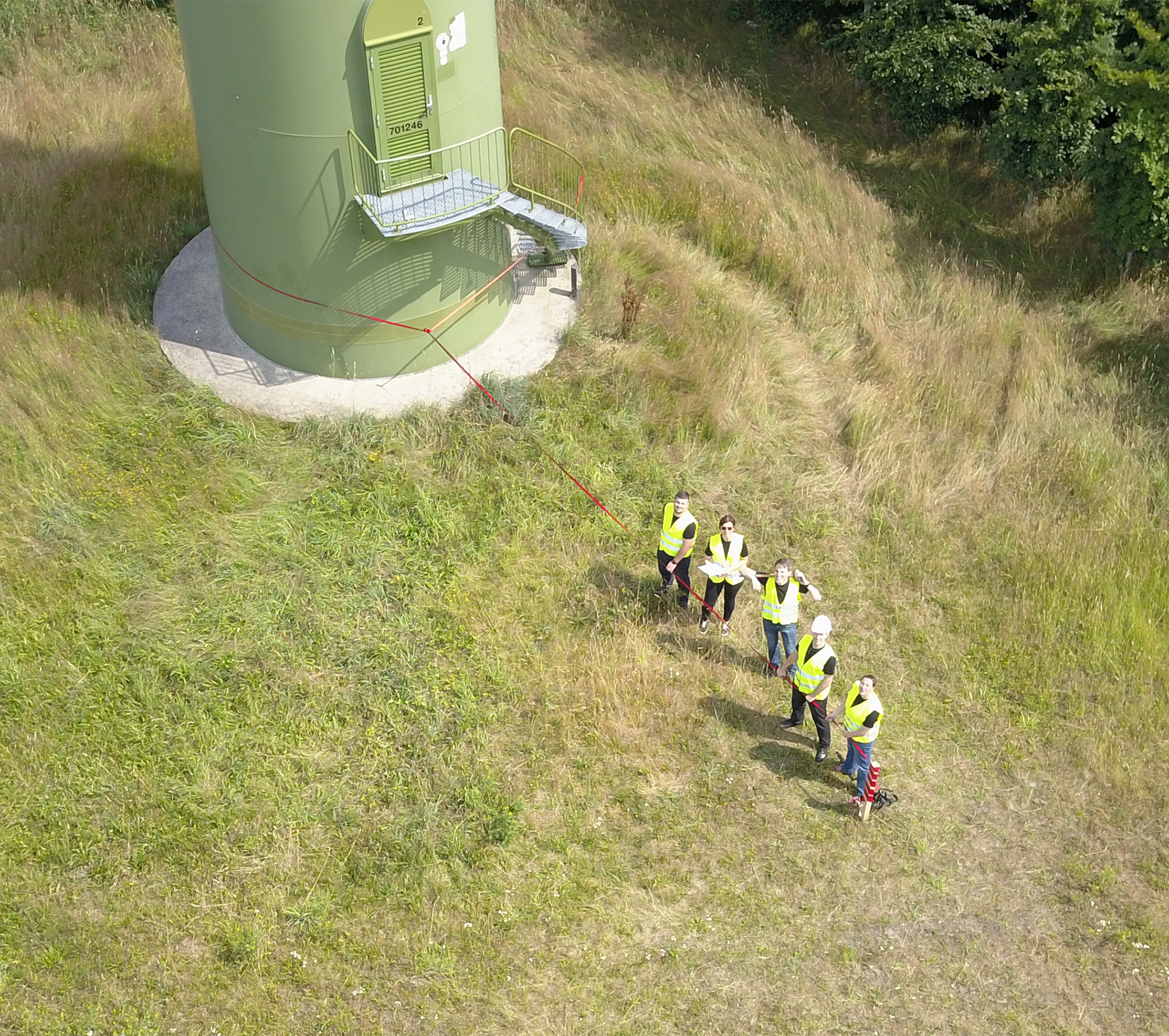 Nach einem kurzen Telefonat mit dem Parkbetreiber und einer raschen Zusammenstellung und Verteilung der To-Do-Liste zog die Anlagen-Anbindung aus, um eine Windkraftanlage anzubinden - und zwar im Wortsinn. Die Anlage wurde standesgemäß mit einem kräftigen Seil umwickelt und an einem Pfahl fest-, äh, angebunden. Nach einem Fotoshooting per Drohne radelten die Kollegen zum Swingolf-Platz weiter und fuhren abends zum gemeinsamen Grillen.