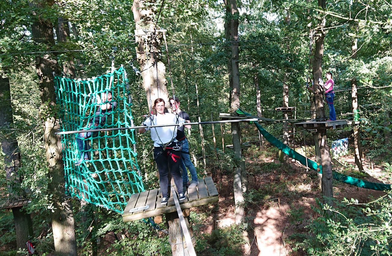 Dennoch stellten sich die Kollegen tapfer der Herausforderung, und gemeinsam zu zittern, machte es vielleicht wirklich etwas leichter. Je höher man kletterte, desto lauter wurde einerseits das Jammern, andererseits aber auch der Zuspruch derer, die diesen Punkt bereits überwunden hatten. Die größte Herausforderung der Kletterrouten war ein vertikal gespanntes Netz, in das man von einem Baum aus hinein schwingen musste. In einer äußerst emotionalen halben Stunde überwand die gesamte Gruppe schließlich auch dieses Hindernis, um anschließend den Wald über eine Seilbahn zu verlassen.