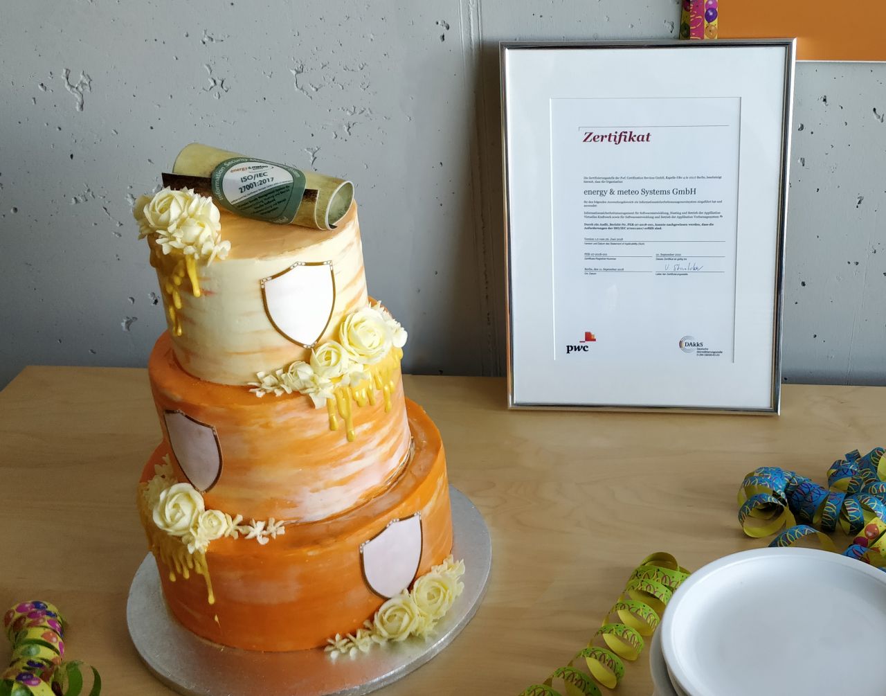 Da das gesamte Unternehmen einen enormen Arbeitsaufwand in die Einführung des ISMS gesteckt hat, ließ unsere Geschäftsführung es sich nicht nehmen, eine kleine Party zu diesem Anlass zu schmeißen. Als absoluter Blickfang wurde eine Torte bestellt und nach kurzer Ansprache wurde das Zertifikat gebührend gefeiert.