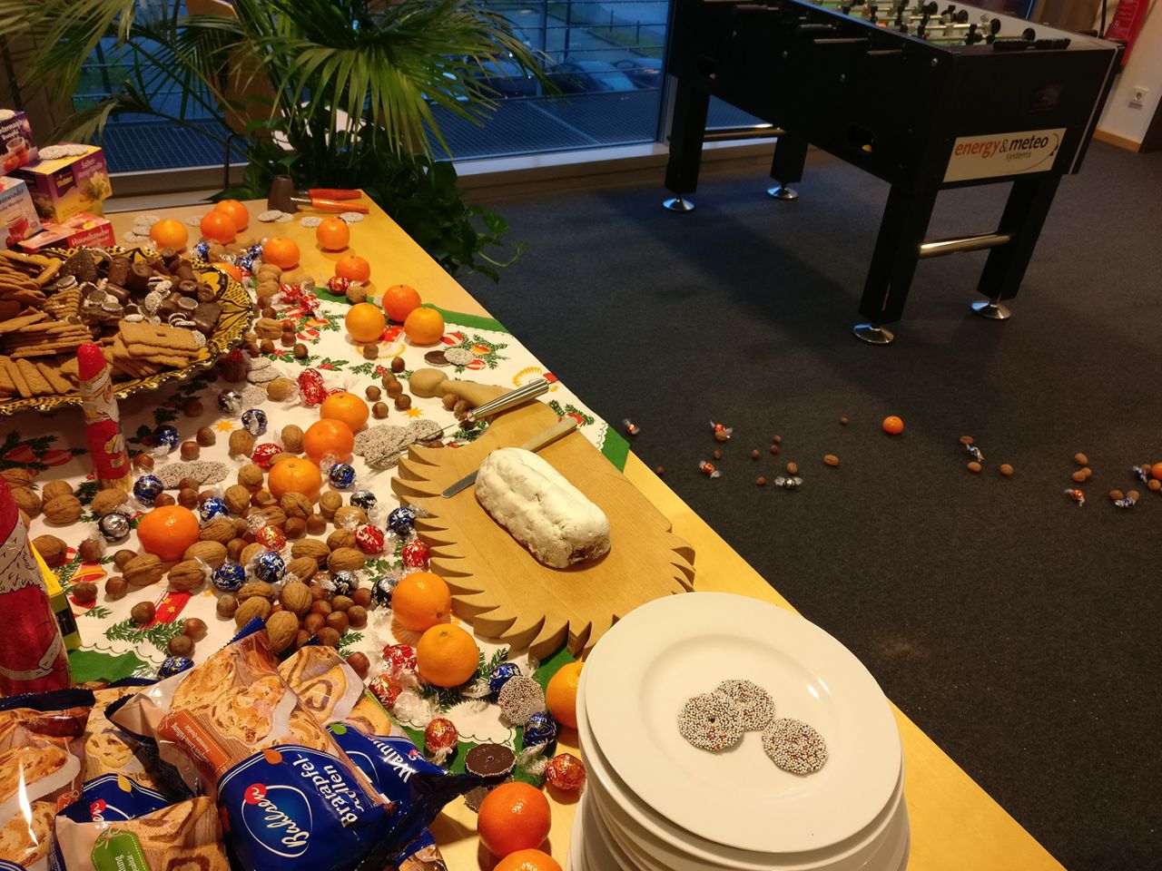 Da kommt man am Nikolausmorgen nichtsahnend zur Arbeit und wird von einer Spur aus Nüssen, Schokolade und Clementinen empfangen. Bereitwillig folgten wir der Spur bis zu einem großen Tisch, auf dem die Bescherung ihre volle Ausmaße zeigte: Der Nikolaus hat für uns Stollen, Kekse, Schokolade, Clementinen, Nüsse und Tee aufgebaut. Da wollen wir mal ein Auge zu- und stattdessen die Leckereien verdrücken.