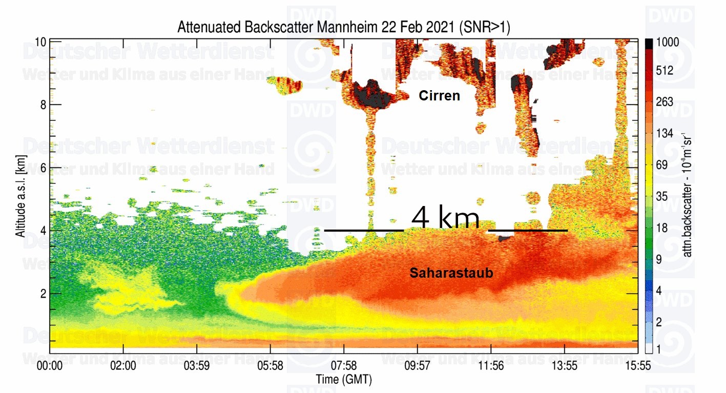 Figure: Ceilometer output (from Mannheim) of the German Weather Service.