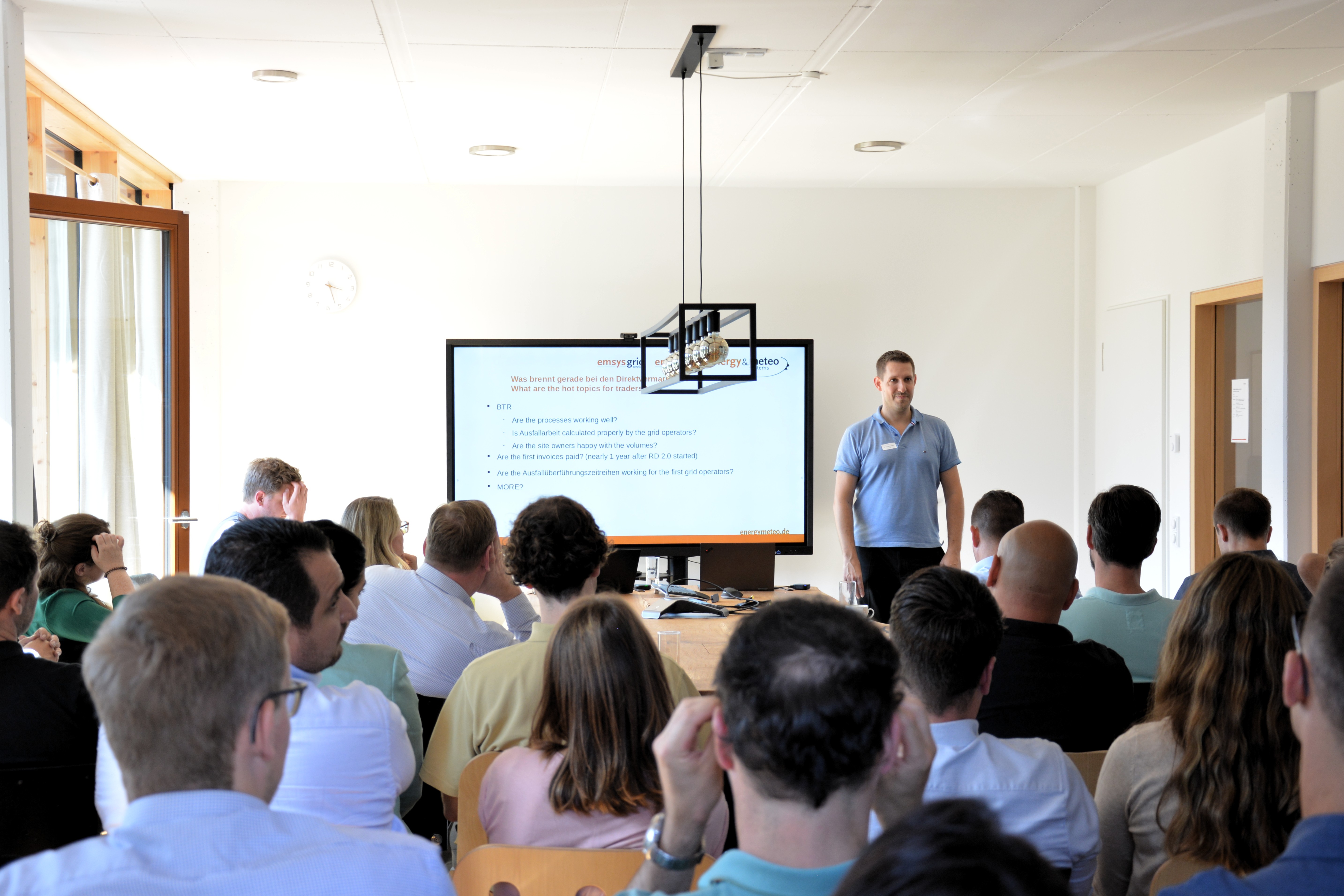 In presentations, around 40 power traders of renewable energies learned about the challenges of grid operators in the area of redispatch 2.0 which emsys is dealing with and where the focus lies for power traders. In addition, special attention was paid to the current topic of IT security.