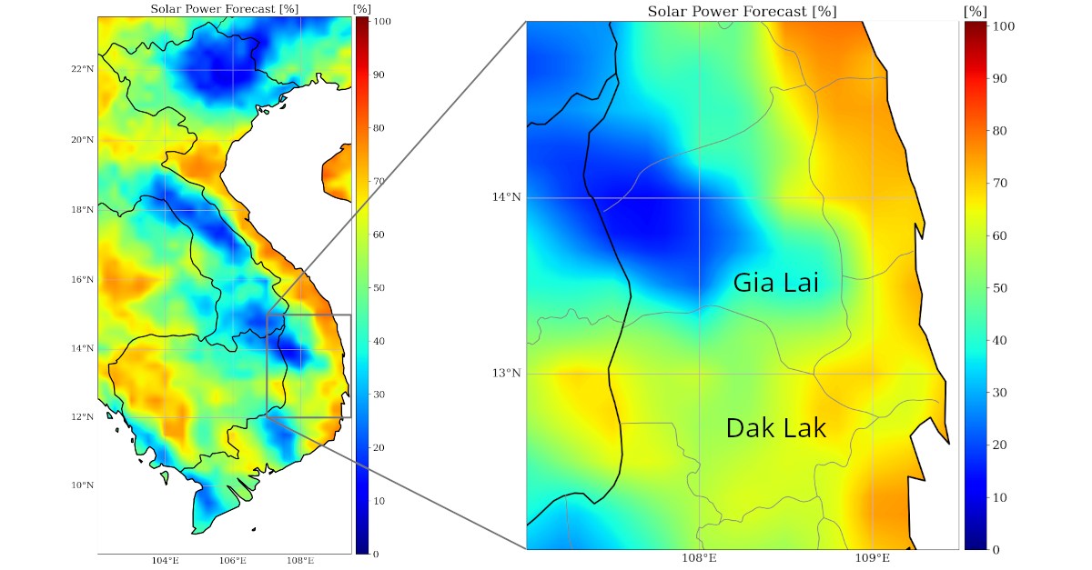 Our day-ahead predictions cover the entire rooftop pv systems in the provinces Dak Lak (520 MW) and Gia Lai (483 MW). Both are located in the South of Vietnam where the power system is particularly struggling with high shares of volatile solar power production. We provide the forecasts to the Power Companies of Dak Lak and Gia Lai, the electricity suppliers in these provinces, for a better visibility and integration of solar power production in their control area.
